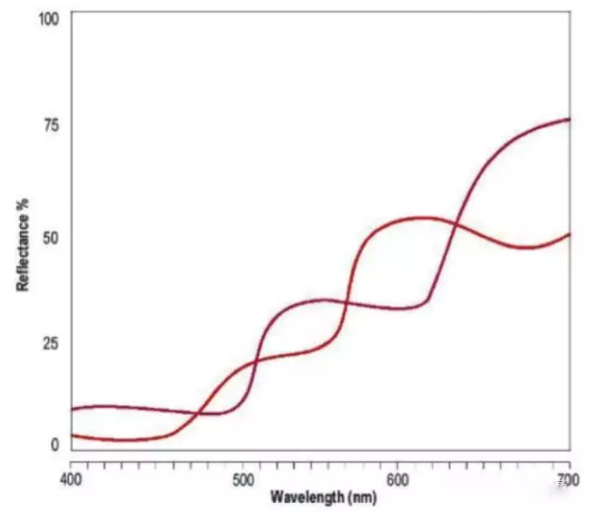 上圖顯現(xiàn)了兩種赤色的反射曲線。兩條曲線都激烈吸收藍(lán)色,都適度地吸收綠色,都適當(dāng)強(qiáng)地反射赤色。注意到兩條曲線在相互之間扭曲? 當(dāng)兩個(gè)物理樣本之間有最少三次交叉,它們即是同色異譜對。假如物體是同色異譜對,同色異譜景象清楚明了;并且,盡管有時(shí)好像是一樣的色彩,但它們不會在一切照明條件下都匹配。