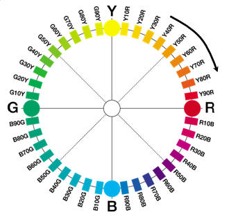 色相環(huán)上有四種五顏六色原色,黃、紅、藍(lán)、綠,它們把悉數(shù)圓環(huán)分紅四個(gè)象限,每一個(gè)象限有分為100個(gè)等級(jí)。要想判別某一個(gè)顏色的色相,首先要判別出該色相坐落哪個(gè)象限內(nèi),然后再判別發(fā)生這一色相所需兩原色的相對(duì)份額。以象限Y_R為例,從Y到Y(jié)50R,黃對(duì)紅的優(yōu)勢(shì)逐步削減;從Y50R到R,紅對(duì)黃的優(yōu)勢(shì)逐步添加,一直到紅原色為止。若用百分比來(lái)闡明顏色的這種標(biāo)法,就簡(jiǎn)單了解顏色標(biāo)號(hào)的含義。例如一個(gè)顏色的標(biāo)號(hào)為Y70R,就表明這個(gè)顏色中赤色對(duì)黃色有70%的優(yōu)勢(shì),而黃僅僅占到30%。