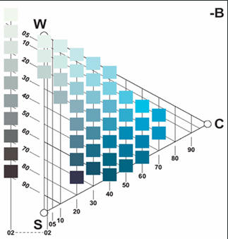 NCS顏色立體的垂直剖面圖的左右半側(cè)各是一個(gè)三角形,如圖所示: