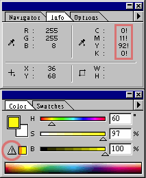 第一是油墨沒有辦法印出一切的RGB色彩。通常高亮度的色彩、螢光色、金屬光澤都印不出來,這時程式只好用最挨近的CMYK來替代。假如你用Photoshop的時分發現選擇的色彩方塊多出一個三角形的驚嘆號(參閱下圖),或是CMYK數值后邊加了一個驚嘆號,表明該色彩是無法打印的。