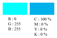 第二個是RGB轉CMYK的時分是根據啥換算規范?就算某個RGB色彩能夠轉換成CMYK,也不代表實踐油墨的色彩會跟螢幕上出現的色彩一樣,通常最大的疑問是發作在青色上面。在未校對的情況下,螢幕上看到的青色(R:0 G:255 B:255)是很亮的色彩(下圖左方色塊),但是實踐打印用的青色(C:100% M:0% Y:0% K:0%)卻是徹底不一樣的感受(右圖右方色塊),連帶運用很多青色的色彩,如藍色及綠色系,都有著嚴峻的色偏疑問。