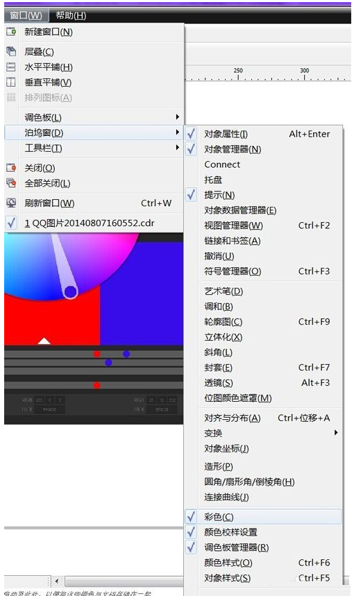 3.從菜單欄上依次打開“窗口”》“泊塢窗”》點擊“彩色”這樣就在右側打開了“顏色泊塢窗”。如下圖所示: