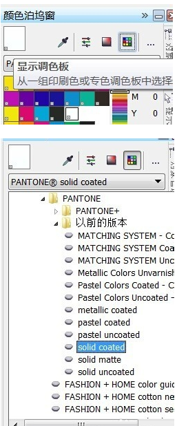 4.打開顏色泊塢窗中的“顯示調色板”按鈕,然后選擇所要轉換的色卡,這個例子使用了PANTONE色卡。如下圖所示: