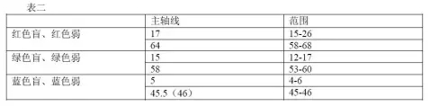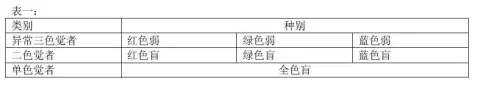 色盲和色弱統稱為色覺障礙,分為先天性和后天性兩大類,色盲是不能辨別某些顏色或全部顏色,色弱則是指辨別顏色的能力降低。先天性色覺障礙的原因在于視色素的光化學不正常。根據對顏色的匹配情況色覺異常可分為:異常三色覺者、二色覺者、單色覺者(全色盲)表一: