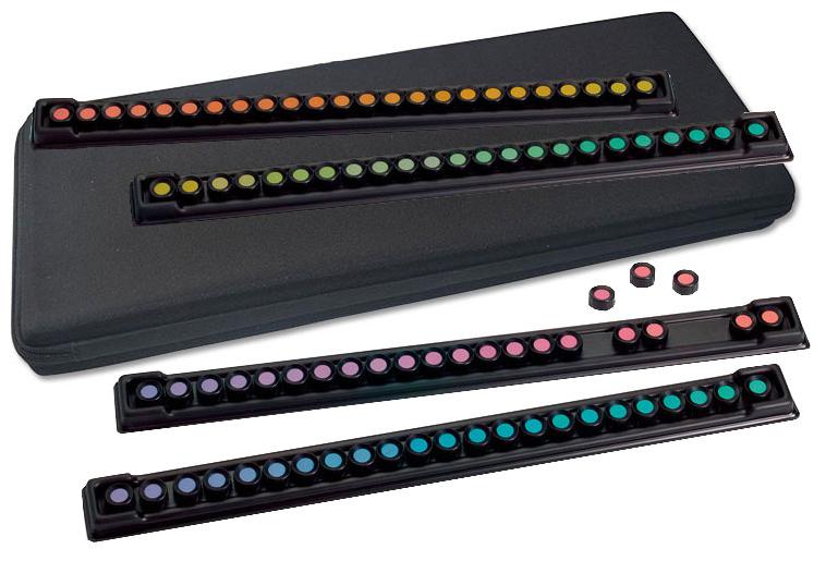 FM100-Huetest 色覺測試 FM100-Huetest 色覺測試是一種檢查辨色能力的簡單有效的方法;本套色覺測試分為兩個部分:FM100 色棋( Farnsworth Munsell 100 Hue Test) 和 FM100 評分系統(Farnsworth Munsell 100 Hue FM100-Huetest)色覺測試是1943 年由 Farnsworth 根據呈色原理,選用標準孟塞爾(Munsell)色樣設計而成。目前已被各種與色彩打交道的行業廣泛應用;