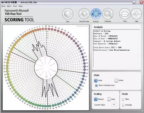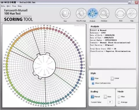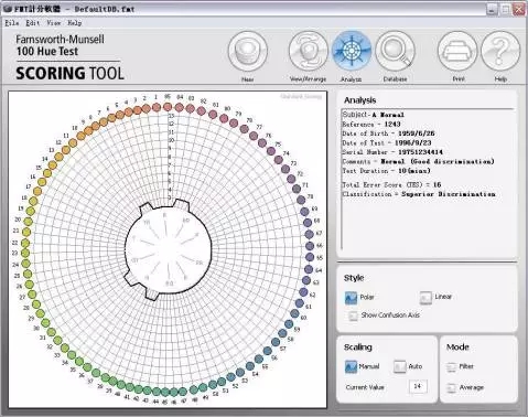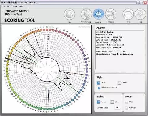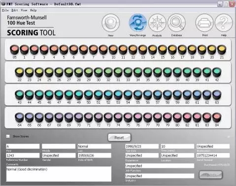 7. 評分:a.打開軟件FM100Hue.exe;b 蓋上每個塑料盒子的透明蓋子,再倒向打開盒子,按照棋子的實際順序,在評分軟件中,調整軟件中棋子的順序;依次完成4 盒棋子的順序記錄;c 填寫被測試人姓名,年齡,工作年限,測試時間,職業類型,批注等點擊保存(save);然后點擊“分析”(Analysis)則右側可以看到其錯誤分數;