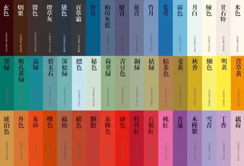 中國風配色卡,這些顏色都是從古代的文物上出現的經典配色取下來的。仔細一看,你會發現里面的名字都很有趣,你光聽名字是猜不到它的顏色的。比如,“竹月”,這是什么顏色呢?它描述的是一種“竹林當中月色清冷”的感覺。也就是,淡淡的藍色加了點紫。