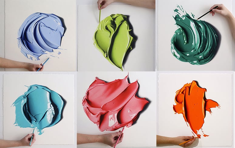 其實第一眼看到CJ Hendry這些手繪色彩作品,許多人覺得不過就是一抹油漆顏料罷了。但出人意料的是,這些畫作都是CJ Hendry用彩鉛一筆一筆完成上色的,無論是從立體感,抑或是光澤度、粘度上看,都很難想象這一抹抹尺寸極大的顏料竟是出自彩鉛,足以達到以假亂真的程度。CJ Hendry逐漸的從超現實主義的顏料色彩畫作延伸到單色房間,完全發揮了她對色彩的豐富想象。在紐約的一個工廠內,她用明快的色彩打造了藍、綠、粉、黃、紅、 橙、紫共7個單色房間,每個房間都由Pantone色彩構成,房間里一一陳列上CJ Hendry對應的pantone色卡畫作并配之潘通色卡號。