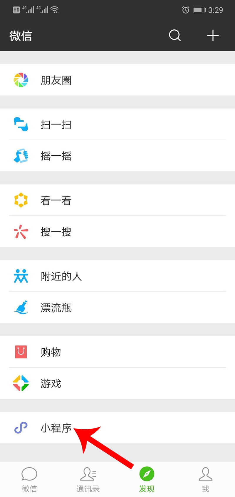 打開微信,找到“發現”的入口,頁面底部一行就是小程序的官方入口;