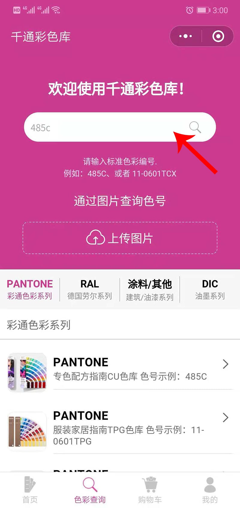 四、出來的搜索結果頁中,點擊其中一個,進入頁面(千通彩色庫),輸入潘通色號,即可直接查詢,比如我要查詢色號:485C;