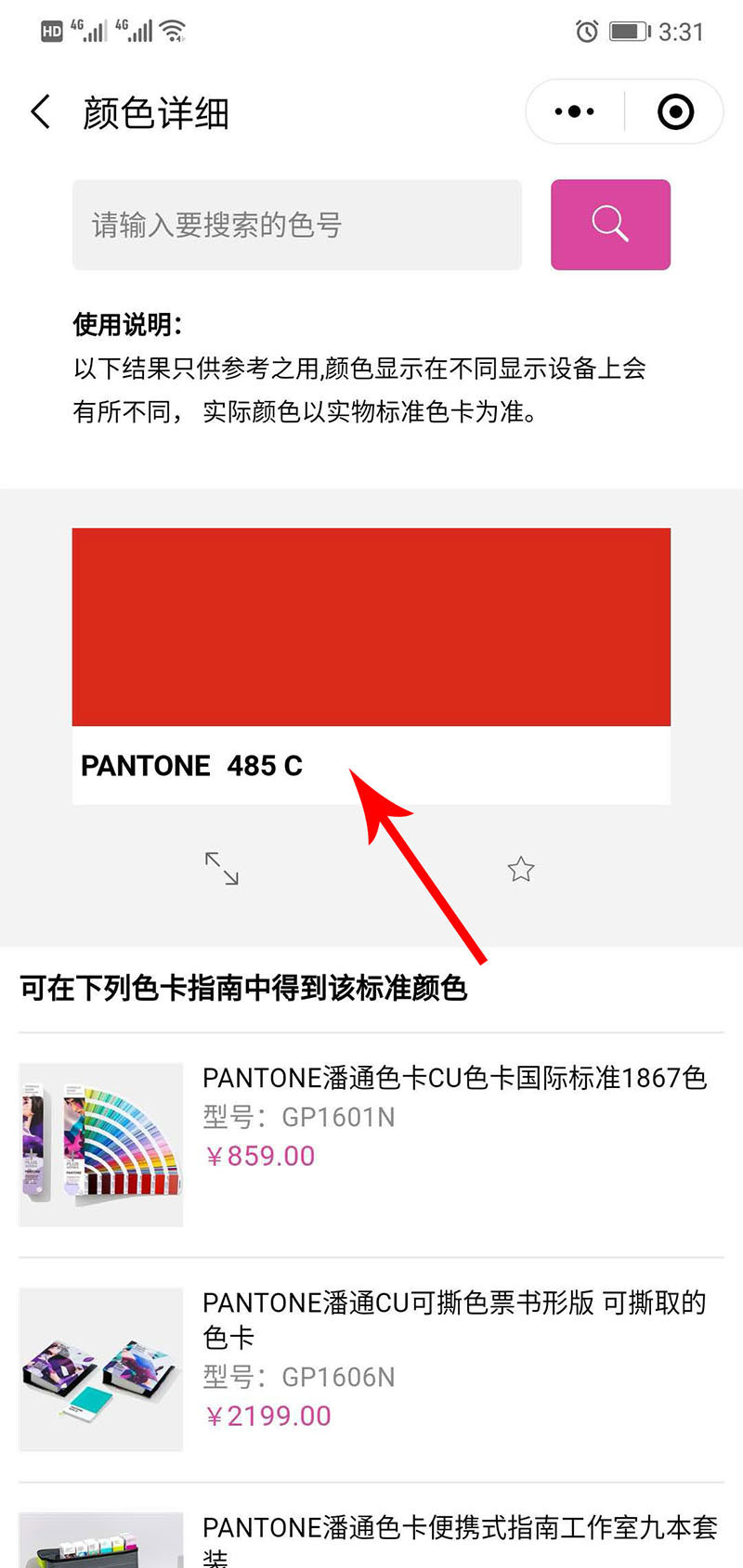 五、查詢后,出來的是對應色號的顏色,以及對應的RGB/CMYK值,設計師可以根據給出的數值在ps、AI等設計工具中找到與之對應的色彩,當然如果要分享給供應商或者同事,也可以直接分享,另外如果要購買含有查詢色號的色彩,可根據下方推薦的色卡直接點擊購買即可,使用起來很方便哦;