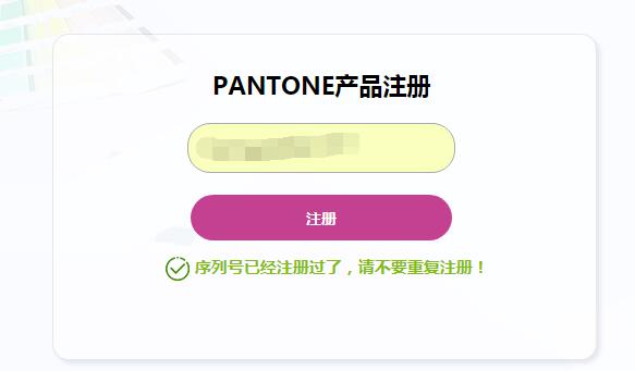當(dāng)然還有可能是另外一種情況,譬如:我公司的樣品色卡之前就已經(jīng)有同事注冊驗證過,我再拿來驗證,將會出現(xiàn)下面這樣的提示屬于正常現(xiàn)象,只要序列號在潘通軟件上能正常使用,也是正版的色卡,不必?fù)?dān)心;