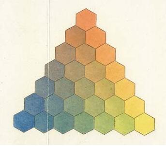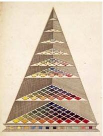 Mayer提出來的三原色理論:所有顏色由紅黃藍三種“原色”組成,分別占據三角形的三個頂點,改變他們的配比關系,可以產生混合的過渡色。過渡色可以按照跟原色的關系遠近,分布在頂點之間的連線上。而Harris的色環里已經有了淺顏色,但是深顏色還沒有。腫么辦,紙面有限,已經放不下那么多深顏色了。。。于是乎,就有了德國科學家Johann Heinrich Lambert的三維色彩金字塔: