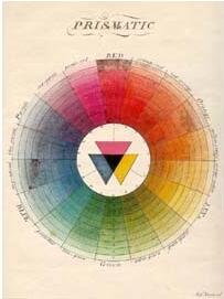 隨著社會的發展,顯然Waller的色表已經無法滿足人類對色彩的需求,到底有沒有比色表更有邏輯更容易記憶又不會把人搞暈的表色法呢?偉大科學家牛頓在研究中意外發現了原來白光可以用棱鏡分離出彩虹色,從此人類才開始有更科學、更精準的顏色研究之旅。后來牛頓大膽的把直線排列的彩虹色帶變成了色輪,藍色和紅色首尾相接,中間增加了紫紅色。藍色紅色之間的大段空白被銜接上了,色彩之間的關聯更加直觀。不但所有能明顯識別出來的色相都標注在色輪里,還有了種輪回的哲學意味。
