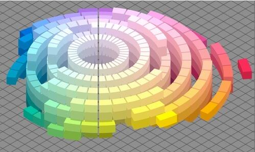 Munsell色空間的模型是在堅實的實驗數據基礎上完成的,這是Munsell體系經久不衰的重要基礎,可以看到,Munsell色空間里有局部地方會突出一塊,表示這里放了一個額外的顏色,另一些地方凹進去一些,表示這里木有顏色可放了,空著。