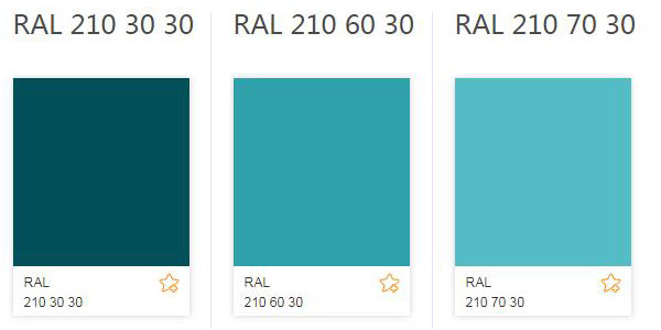 以1976發布的國際通用的CIELab的色彩空間為基礎,德國勞爾RAL專為色彩設計而開發的配色系統,是以一個有規律次序排列的1825種顏色,所有這些7個數字的色彩明暗被劃分為單獨的RAL顏色。這和RAL古典顏色標本之間的不同是RAL設計系統的顏色代碼不是任意排列的。它們顯示了色度、明亮度及色彩之強度的工業技術測量值。例如:RAL 210 30 30是一個色度210、亮度30、色彩強度為30的顏色色調。如果你希望將這個顏色色調同一個更亮的色調結合,你可以選擇RAL 210 60 30,從而你可以得到一個具有更高亮度60的顏色,此外你還可以選擇色號為RAL 210 70 30,選出來的色彩將會更亮,如下圖: