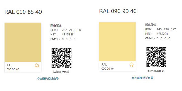 又如:新增色號中的RAL 090 85 40是一個比較暗一點的色彩,如果你想要一個比它更亮的色彩,你可以選擇色號RAL 090 90 40的色彩;