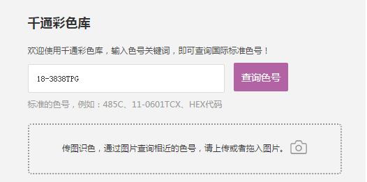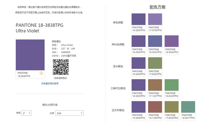 一、以美國色彩機構PANTONE潘通為例,查詢2018年的年度色彩“紫外光色”的配色方案有哪些,可以這樣,在色庫輸入框中輸入“紫外光色”的國際標準色號:18-3838TPG,點擊查詢色號;