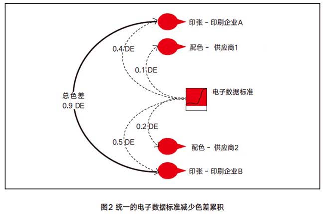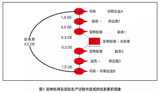 圖二中,同理,每個層級之間都存在一點色差,最終生產出來的東西色差值為什么只有0.9DE,遠遠比圖一中的4.5DE小很多呢?因為圖二中是基于電子數據標準為參考,有具體的數據數值,在溝通過程中才不至于人為現象出一個色彩來。