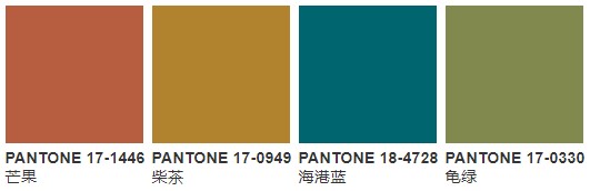 (PANTONE 17-5722 瓶綠色、PANTONE 14-4318 天藍色、PANTONE 14-0627 影子綠、PANTONE 20-0161 甲蟲翼、PANTONE 17-2411毒菌、PANTONE 17-1446 芒果、PANTONE 17-0949 柴茶、PANTONE 18-4728 海港藍、PANTONE 17-0330 龜綠)