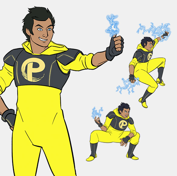 Bash是該組織的惡作劇成員。他狡猾而迅速,是人類體現閃電般的火花。他喜歡他的隊友,但他可能有點自私,他害怕被視為脆弱。他的金屬盔甲是深灰色,幾乎是黑色(PANTONE 10393 C); 他的心臟是一個很酷的,無法穿透的盾牌。相反,他的緊身衣褲盡可能大聲 - 電黃色,是他揮舞的閃電的象征。他的眼睛是明亮的藍色(PANTONE 2915 C),另一個對他的能量和超自然力量點頭。