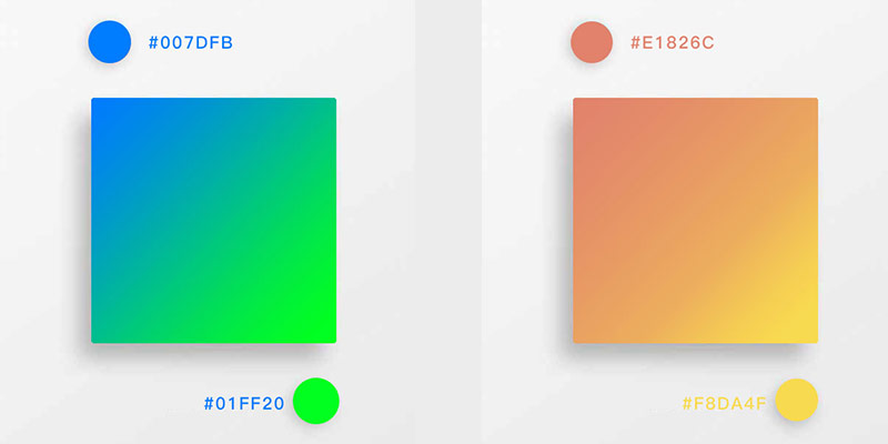 掌握了純色組合搭配方法后,可以來學學漸變色的色彩搭配。漸變色,至少是雙色,雙色漸變(線性)單從色相來講,可以大致分為三種:小、中、大。