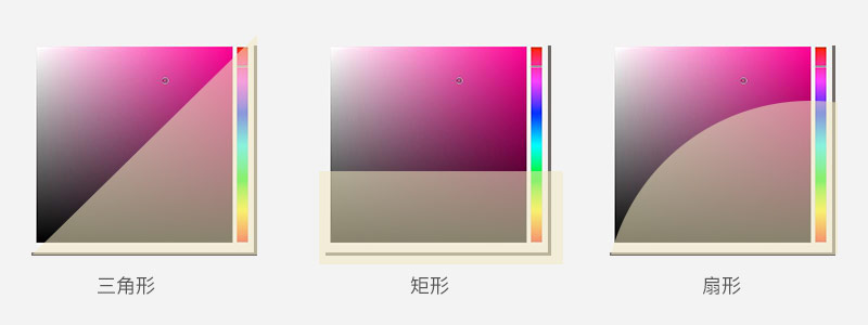 那么搭配色彩,有什么顏色是“禁區”嗎?當然這里說的“禁區”是帶雙引號的,沒有什么是絕對的禁區,這里的“禁區”只是說顏色在這個區塊不易被控制,在還沒有駕馭好基礎色彩搭配之前,盡量少碰“禁區”的色彩。“禁區”的色彩一般分為三種:三角形禁區、矩形禁區、扇形禁區,如下圖: