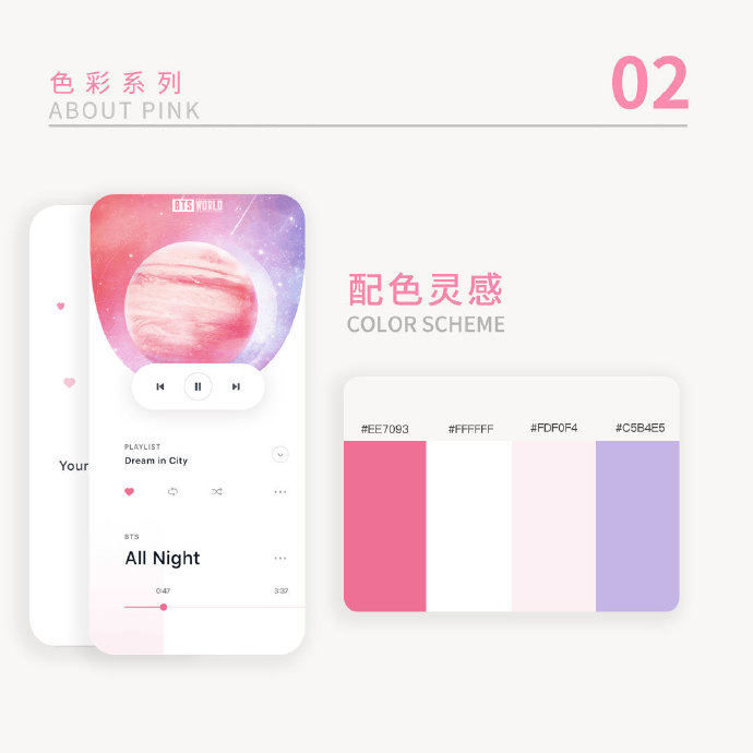 色彩搭配在整個UI搭配環節中占有非常重的比重,它的重要性是不言而喻的。除了這里分享的9組粉色配色方案,粉色和其他色彩搭配同樣可以碰撞出別樣的火花。配色好看與不好看,很多時候是要學會相信自己的心,順從自己內心的想法,挑選自己真心喜歡的顏色,設計出來的配色效果一般不會令人太失望。所以無論學習哪種色彩搭配方法,相信自己的心而不要相信頭腦才是最重要的原則。
