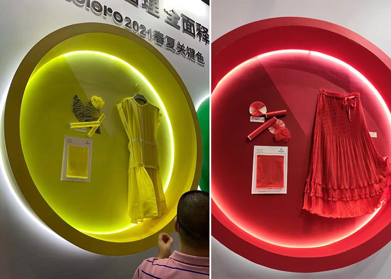靜謐綠的色彩靈感來(lái)自2021春夏,COLORO對(duì)于“靜謐綠”的解讀:綠色已經(jīng)在多個(gè)季節(jié)中獲得了成功,并且色相范圍廣泛。但對(duì)于2021春夏,綠色將朝著冷調(diào)方向演變。Quiet Wave的樂(lè)觀主義和未來(lái)主義特質(zhì),使其成為下一個(gè)十年開始的完美情緒設(shè)定。它的靈感更偏向于科技,具有冷靜、超脫的性格。另外展會(huì)上還呈現(xiàn)了COLORO vs WGSN聯(lián)合推出的2021年春夏其他關(guān)鍵4大色系,分別是:火焰紅、檸檬冰沙黃、智能藍(lán)、沉靜灰,展會(huì)現(xiàn)場(chǎng)布置中通過(guò)服飾及紗線呈現(xiàn)了這這幾大關(guān)鍵色的應(yīng)用效果。