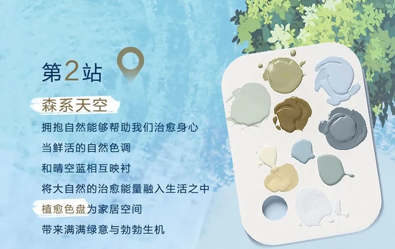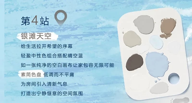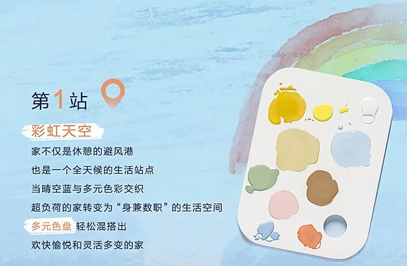 為此,多樂士還圍繞年度色“晴空藍”推出了四個主題的色彩搭配方案,分別是“彩虹天空”、“森系天空”、“藝術天空”以及“銀灘天空”;