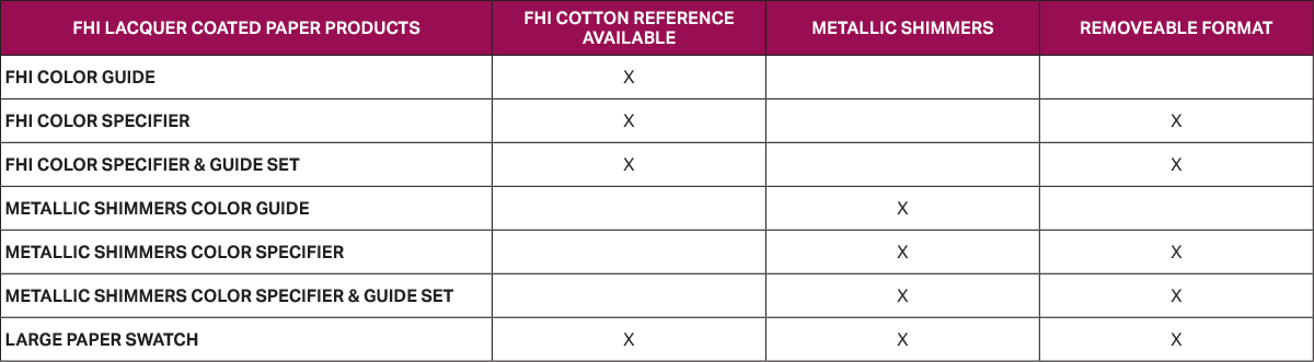 我們的服裝,家居 + 室內裝潢紙版產品是在紙材上使用一種硝化纖維涂層,經由顏料配方染出的。服裝,家居 + 室內裝潢色彩指南 [FHI Color Guide] 與色彩手冊 [Color Specifier] 是比對彩通棉布版色卡 [Pantone Color Swatch Card] 標準以確保色彩一致性。色彩經目視評估,并且也從45度視角在控制的照明下測量過。