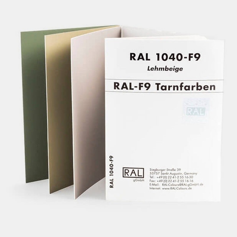 RAL F9是德國部隊使用的迷彩色。這套色卡用于配色和質量控制,提供X-Y-Z值、與原始標準的色距和反射率曲線,用于環裝顏色標準用于配色和顏色控制,并包含60°和 85°光的信息,以及色度測量值