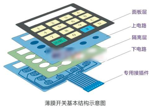 薄膜開關(guān)是集按鍵功用、指示元件、儀器面板為一體的一個操作系統(tǒng)。是選用PC,PET,F(xiàn)PC及雙面膠等軟性資料,運用絲網(wǎng)印刷技術(shù)制造而成的 多平面組合密封的集圖形、按鍵、標記符號顯示、導電及薄膜開關(guān)功用于一體的塑膠電子制品。廣泛應(yīng)用于電子通訊、工業(yè)操控、醫(yī)療器械、汽車工業(yè)、儀器儀表、家用電器、兒童玩具、軍工設(shè)備等行業(yè)和領(lǐng)域。常見薄膜開關(guān)各部分組成原料:
