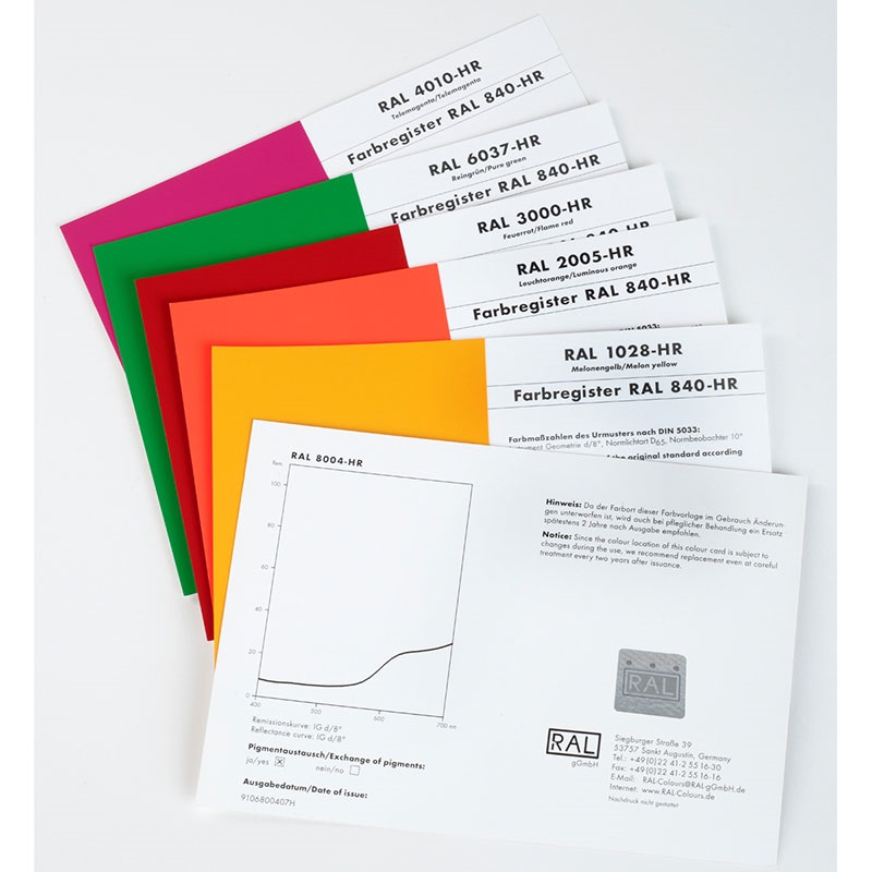 憑色號訂購RAL 840-HR原標準色彩單張,包含勞爾經典系列全部213個顏色可均選色,顏色為半啞光色,是用于配色和質量控制的顏色原標準。這套產品提供XYZ值、與原始標準之間的色距以及反射率曲線。半光澤的顏色基礎色卡為RAL840-HR,有光澤的為RAL841-GL,這些顏色基本色塊滿足了大范圍的應用,已被許多重要公司及研究機構所使用。RAL840-HR及RAL841-GL 顏色注冊都作為顏色樣本應用于設計中,同時它們也包括了安全和信號色符合DIN及ISO規定的顏色要求。